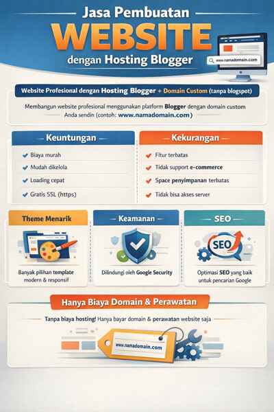 Kami menyediakan jasa pembuatan website profesional menggunakan platform Blogger (Blogspot) dengan domain custom. Solusi ini sangat cocok untuk UMKM, personal brand, company profile, portfolio, dan landing page yang menginginkan website hemat biaya, stabil, aman, dan mudah dikelola. Dengan menggunakan Blogger sebagai hosting, klien tidak perlu membayar hosting bulanan/tahunan, cukup membayar domain dan biaya perawatan website.